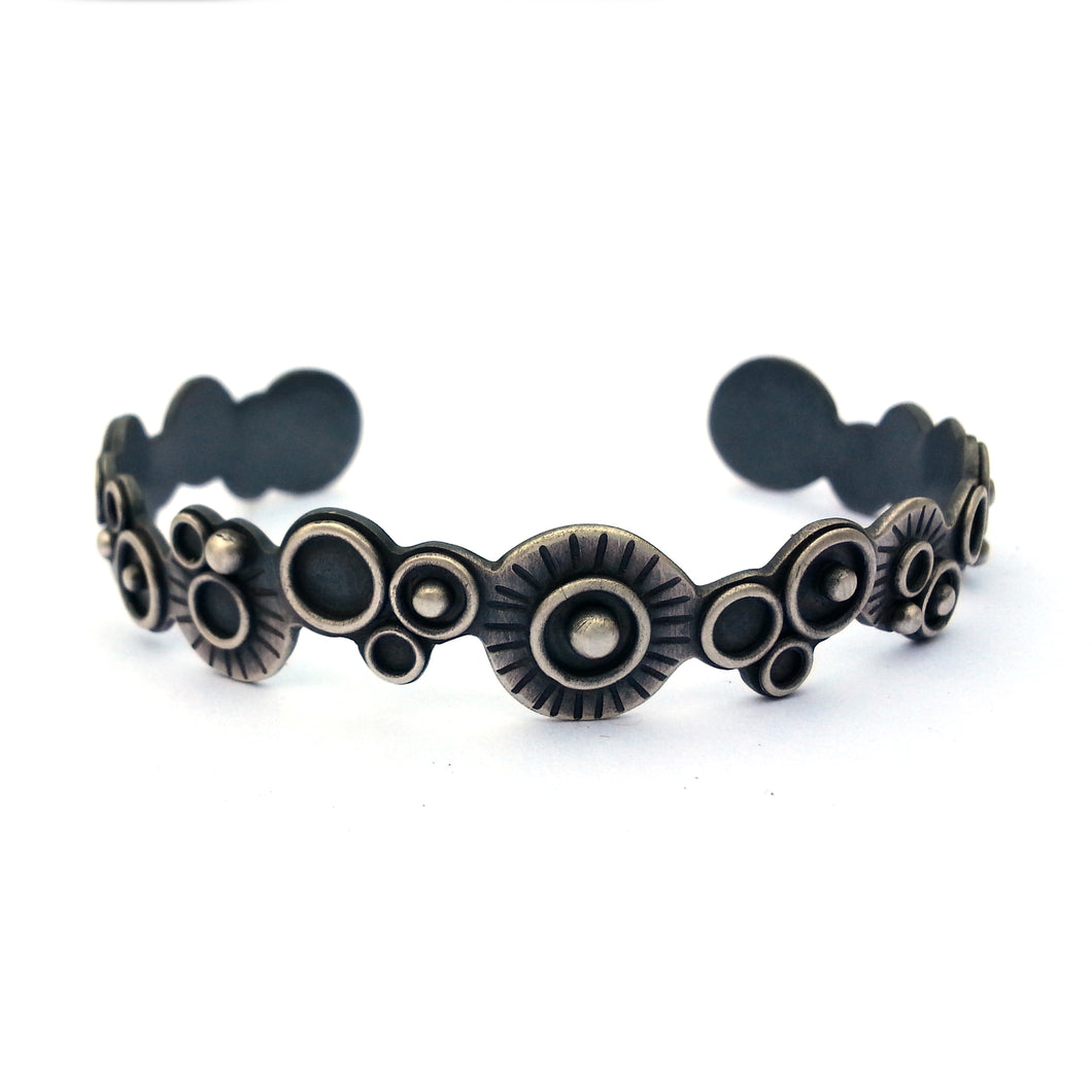 Sterling silver cuff bracelet inspired by space. Sterling silver circles, spheres and stripes orbit along a blackened sterling silver cuff.